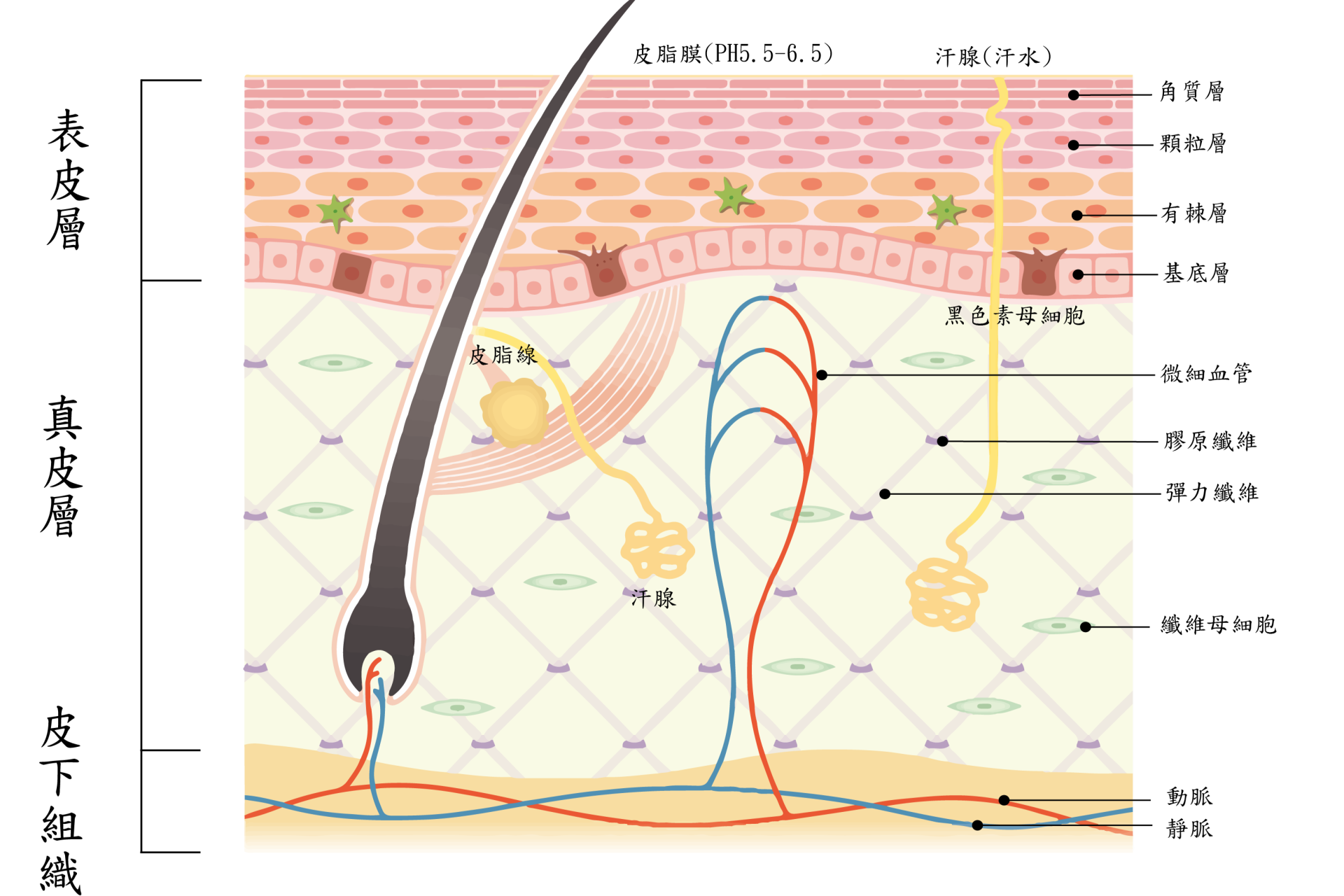 而皮膚可以依從外到內分為主要三層:表皮層、真皮層、皮下組織。 #影響皮膚外觀及健康的部位主要在表皮層和真皮層,想要一張紅潤透亮好膚質,就要知道肌膚的基本構造,才不會保養品一買再買、一試再試卻還是無法養出自己心目中的好膚質。