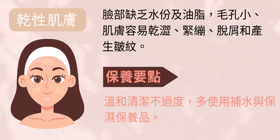 保養要點:要注意不過度清潔肌膚,多使用補水及鎖水的保養品滋潤肌膚。