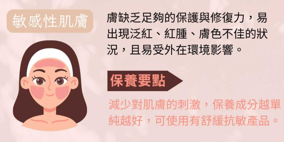 保養要點:敏感性膚質最怕「刺激」,因此保養品成分越單純越好,選擇無色料、無香精、無酒精的,減少過多化學成分、香料、酒精的刺激。也可挑選舒緩抗敏的產品。