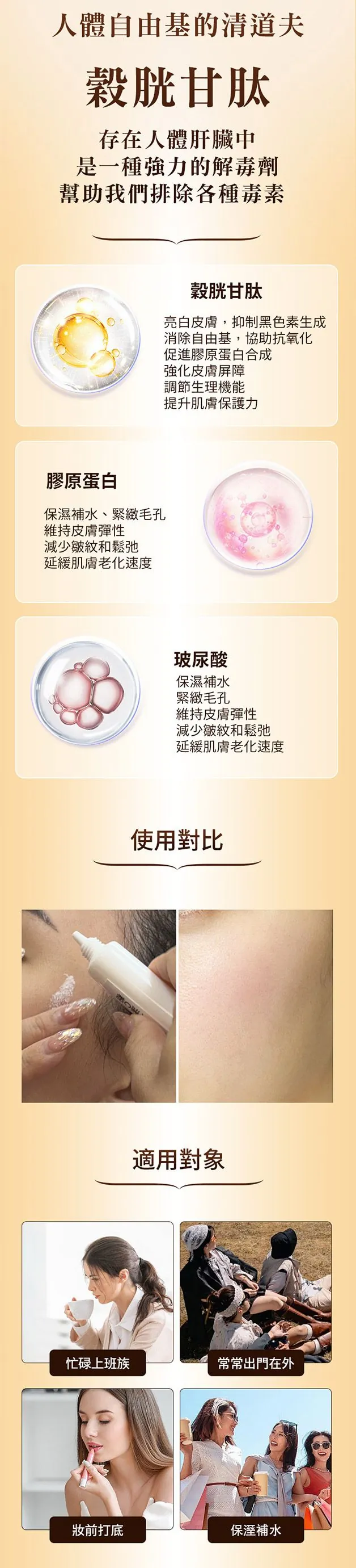 均勻膚色、高光透白、保濕補水、緊實修護、抗氧提亮